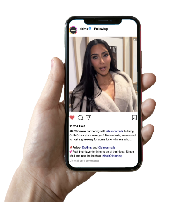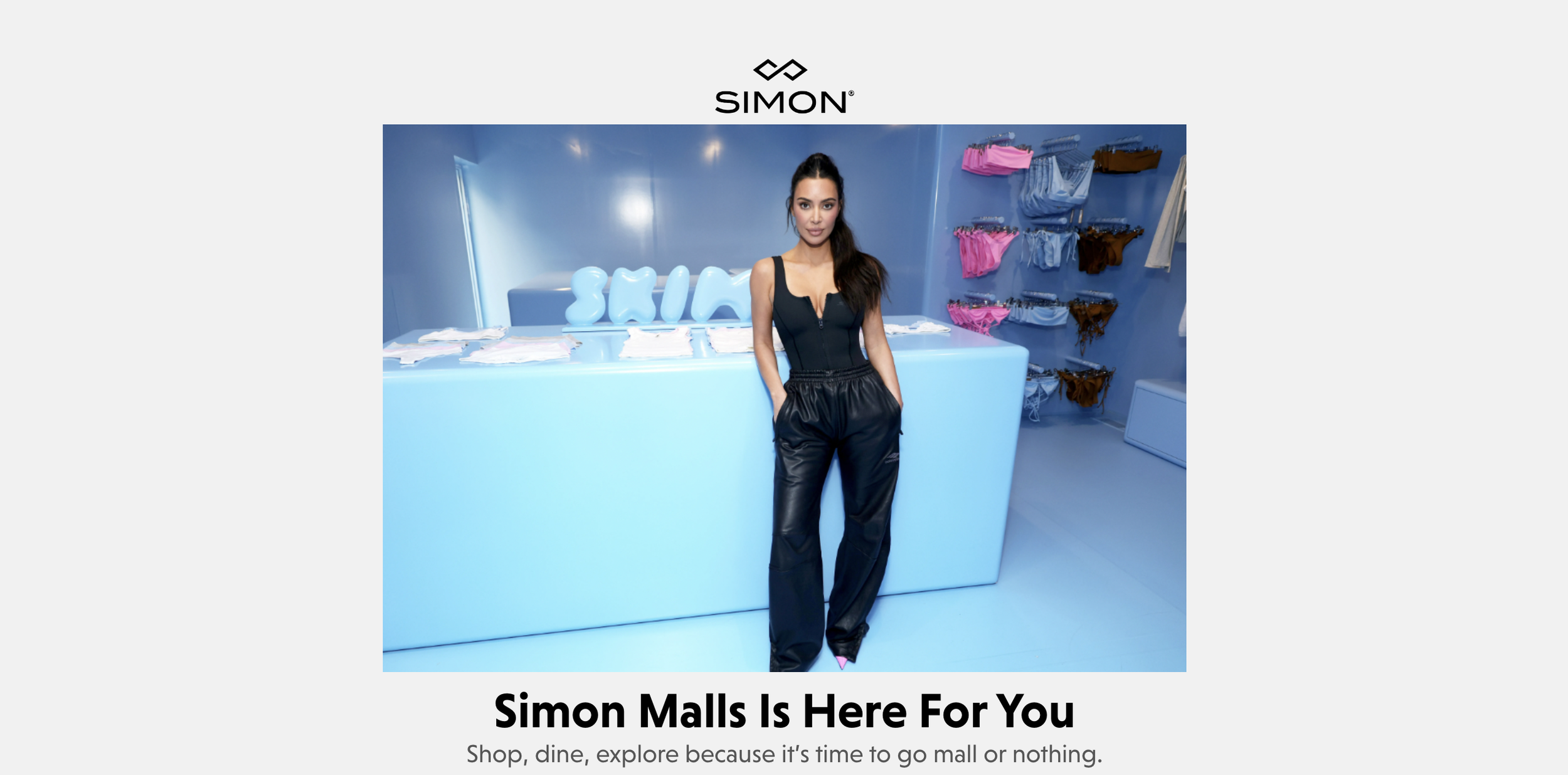 “Hey everyone! It’s Kim. Just wanted to say that our SKIMS pop-up store will be opening in just three days. To get you all excited, I wanted to share that we will be giving away free items to a randomly selected group of people who follow us and Simon Malls and post a mall memory using the hashtag Mall or Nothing. Good luck! And to the LA Simon Malls — see you soon!”